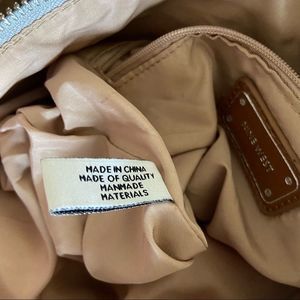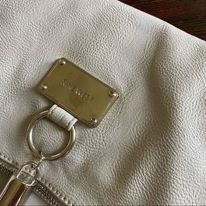 Nine West Fold Over Cross Body Bag, off-white gray tone, has a zip top closure, folds on magnetic snap on bag, metal Nine West emblem on front w/ fringe detail, interior zippered pocket, preowned good condition, there are two discoloration‘s pictured above and an L-shaped crease on the back, small tear on interior lining pictured above, otherwise lining is in perfect condition, no interior stains, all flaws are small and not very noticeable but are present, bag still looks pretty & stylish.