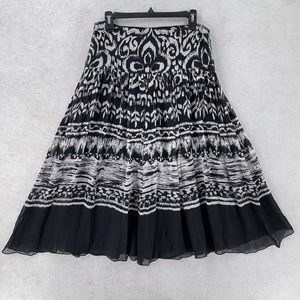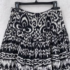 Step out in style with this Nine West bohemian-inspired maxi skirt. The skirt features a black geometric pattern, layered accents, and is made of 100% silk. Its size 4 fits regular-sized women and it's perfect for a casual outing or a fun evening with friends.