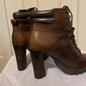 Tall heel peep toe booties dark brown genuine leather, lace front for ease, bootie has never been worn its one of many shoes in my collection.