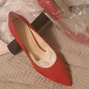 Raspberry Suede, with a reddish hue, pointed toe. See pictures for exact description and measurements of heel. Brand new shoes I forgot I had , too small anyway for me...
