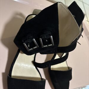 Nine West 8 Black Suede Sandals Cuffed Ankle Buckle Block Heels Galiceno EUC