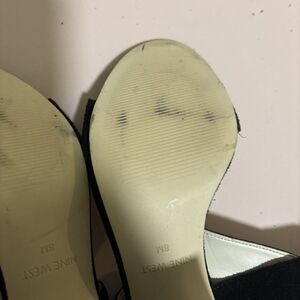 Nine West black suede sandals with a cuffed ankle design and double buckle accents. The block heels provide a comfortable mid-height boost, perfect for any occasion. These sandals are versatile and suitable for summer, fall, and spring. They are made of high-quality leather and were crafted in China.
