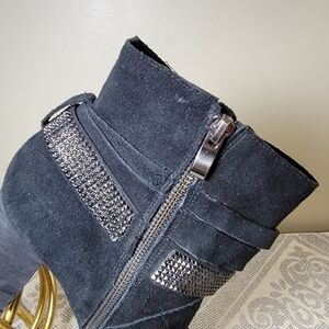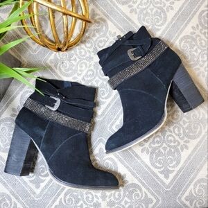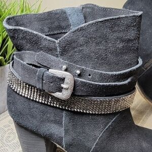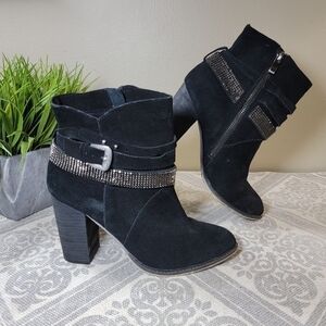 Beautiful black suede booties with western inspired buckle, bling and strappy design details. Stacked heel. Approximately 3.75 inches.