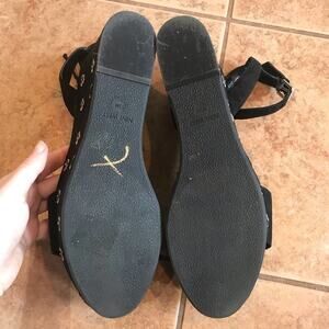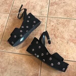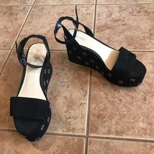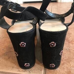 Details: Nine West shoe wedge heel with peep toe and buckle ankle strap, floral detail for bohemian vibes hippie