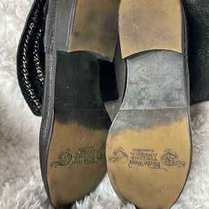 Nine West American Vintage Barstool ankle Boots Black Leather chain accent SZ8M pre owned in good used condition signs of wear on the outer soles see all pictures any questions please message.E2