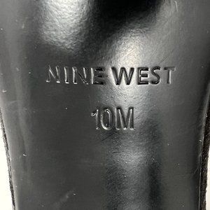 Elevate your style with these stunning Nine West Ammazo heels. Designed with a peep toe and ankle strap with buckle and black and silver tassel accents. These stiletto heels are perfect for weddings, parties, and formal events. The black vegan suede upper material adds a touch of luxury while the ultra-high heel height creates a bold statement. These shoes are a size 10 with a medium width and were manufactured in China.