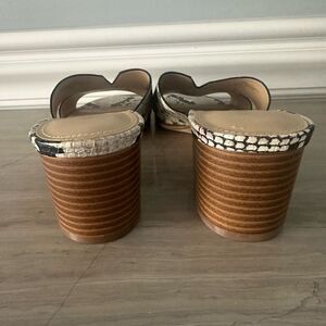 Step out in style with these chic, black, grey and cream colored snakeskin print, open toe sandals with 1 1/2” wood stacked heels. Perfect for any occasion. New without box.