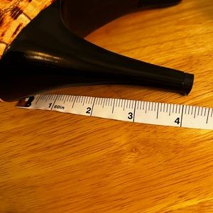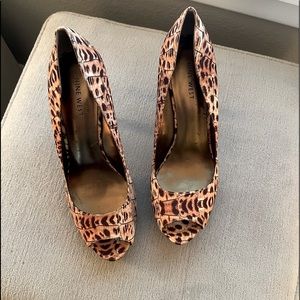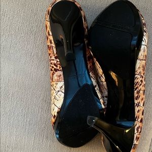 It looks like they have never been worn. Very stylish pattern to flatter your little black dress. Year around fashion. Four inch heel. Black trim and heel are shiny. animal print, open toe, party shoes, clubbing shoes, unique shoes, sexy shoes