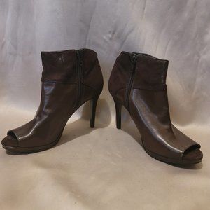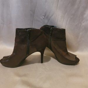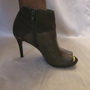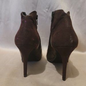 Peep Toe High Heel Ankle Boots in classic Brown that pair perfectly with anything and everything. Side zipper. Suede & leather. Slight signs of wear but still in great condition