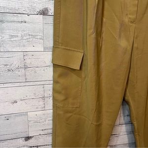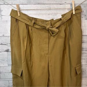 Nine West Ankle Tapered Utility Pant High Waisted Tie Olive Green Size XXL- comfortable and versatile plants that can be dressed up or worn more casually- ankle length loose relaxed fit with cargo pockets and front pockets- pleated front with tie belt that gives an impression of a paper bag pant- unique shade of olive green- soft and light weight material makes it perfect for summer, spring or fall- retails for $48- see pictures with measuring tape for exact measurements