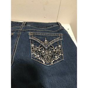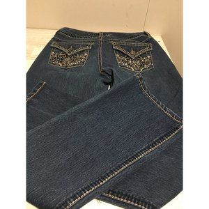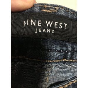 Nine West Annette boot cut jeans size 8 Has rhinestones and silver fits on back pockets. Has two front pockets with watch pocket. Has two button back pockets. Waist measures approximately 15 1/2” side to side. Rise measures approximately 9 1/4”. Inseam measures approximately 30”. Good pre-owned condition.