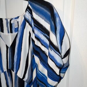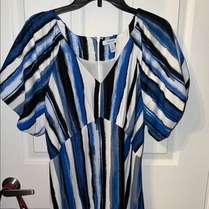 Chic asymmetrical dress with bold blue and white stripes. Features short sleeves and a flowing silhouette.