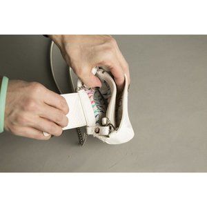 All manmade materials, outer white simulates reptile leather, inner lining is a fun colorful pattern of sexy high heels shoe print. It has 2 main open compartments and one centered zipper closed top. It also has a ID easy show clear pocket.