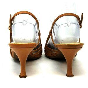 Description: Very nice pair of women's Nine West slingbacks. Features beige canvas at toes, and light brown leather straps for added style. Also features pointy toes, kitten heels and rubber soles. there is a tiny wear spot on inside strap of left shoe. Does not affect the look or wear of the shoe. these shoes will be a classy addition to your shoe collection.
