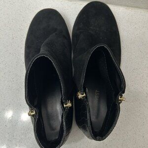 Step out in style with these chic black ankle boots featuring a stylish gold zipper from Nine West! Perfect for any occasion, these boots offer both comfort and elegance. Faux leather and suede stylish duo design! Great gently used condition!!