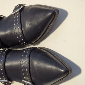 Black faux leather studded pointed ankle boot. I bought these because they remind me of pike boots! Very witchy. Looks great with a casual goth look, the silver accents help tie the boots into a look by matching jewelry.