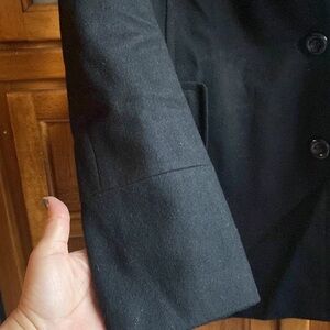 Nine West Black Wool Blend Women’s Coat Size 8. This is a classy looking coat is perfect for the autumn/winter season. 5 Button coat. 3 on the front and 2 buttons on the inside. 2 pockets in the front. wool tie belt.