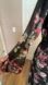 Chic black dress with vibrant floral design. Features pink and green accents. Ideal for stylish outings.