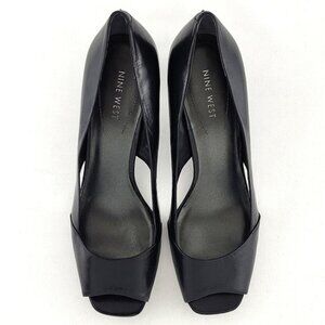 Good pre-owned condition, Nine West black leather square and open peep toe with side cutouts and ecclectic patent heeled shoes, size 7M.