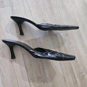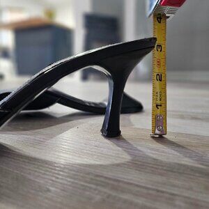 Worn but still some life left. Leather is broken in so it's a soft fit. Heels are 3 inches. Style is a mule with a 3 inch heel and and beige stitching, pointy flat toe.