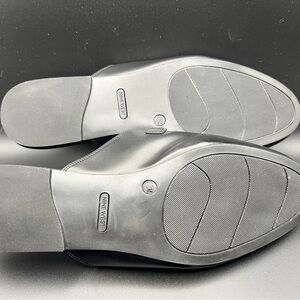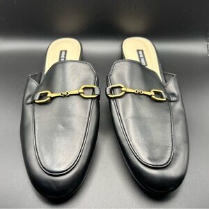 Chic black mules by Nine West. Features a stylish gold accent. Perfect for versatile wear.