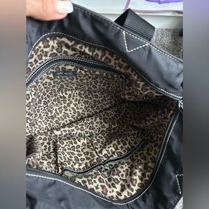 Nine West black nylon shoulder tote style purse. Front and back zippered pockets. Cheetah print lining with pockets inside