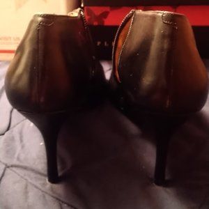 Here for sale we have very used but decent pair of Nine West black toe bootie or shootie heels that are a size 13m. They have flaws mainly on the inside where the zipper is, but not noticed when wearing them. Sorry for the bad pictures. I don't have the greatest equipment but I try my best. lol Also feel free to make an offer!