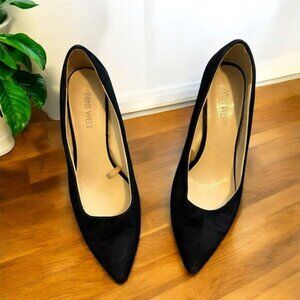 Nine West black faux suede pointed toe pumps heels.