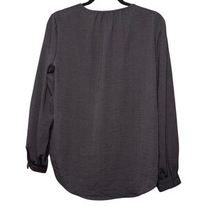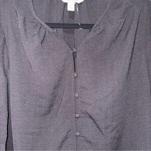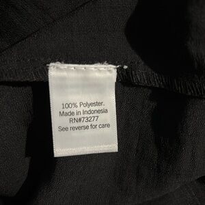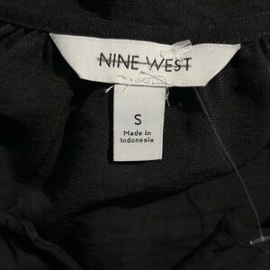 This NWOT black blouse from Nine West features a stylish mandarin collar and ruffled details, offering a chic and versatile look. The buttoned front and flowing silhouette make it a comfortable choice for any occasion.