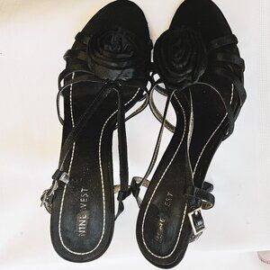 Extend your shoe wardrobe with these Nine West Strappy Black Sandal Shoes. Size 8.5 M. Made with black satin fabric, These heels features a peep toe accented with a rosette shaped fabric flower, High Stiletto Heels (4") for added height and style, Back buckle closure to insure a secure fit while the strappy design adds a touch of elegance making them perfect for weddings, proms, graduation, party/cocktail and other formal occasions. Preowned. No Flaws. Excellent Condition.
