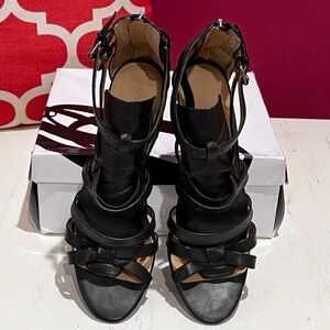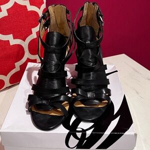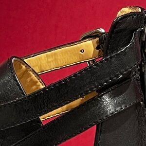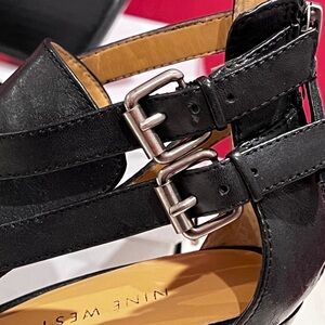 Nine West leather sandals with a sleek black strappy design. Wedge heels perfect for stylish outings. Comfortable and chic.