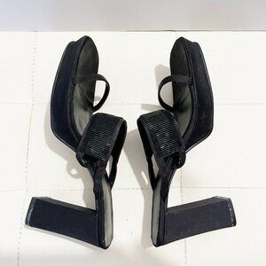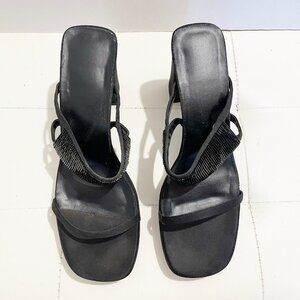 Own these vintage Nine West black block heels / sandals with unique beaded embellishments on the straps. They have a mix of leather on the footbed and satin on the heels and sides platforms. Get height, comfort and bling in one shoe. Pre-owned condition with overall wear and tear on soles, heels and sides. See images. Size 10M