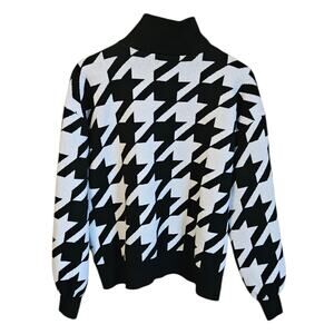Nine West women's houndstooth sweater Black and white oversized houndstooth design Half-zip mock neck Long sleeves, soft knit, cozy and stylish Women's size Large Measurements Laying Flat (approx) Armpit to Armpit: 23in Length: 23in Condition: Good used condition - no stains or flaws. Comes from a smoke-free home. Tags: Nine West, houndstooth, black and white sweater, half zip, mock neck, women’s L, large sweater, cozy knit, winter fashion, fall wardrobe, classic print, trending