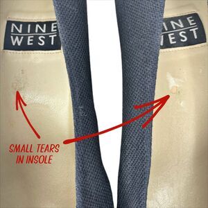 The shoes are new without the box and have no major visible defects. There is a tiny spot on each insole where the top layer has peeled away when a sticker was removed from the shoe.