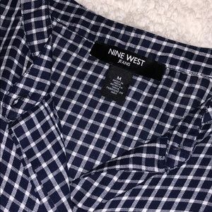 Button down with fabric layer over the buttons • Flared 3/4 length sleeve • Lightweight fabric • Navy and white small checkered pattern