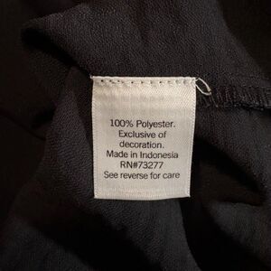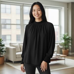 The Nine West Blouse in size L is a black, long sleeve blouse with a mock smocked neck and smocked cuffs. It features a solid pattern with pleated accents and fabric-covered buttons, creating a whimsigoth and romantic chic style perfect for business casual or workwear occasions. Made from polyester, this blouse is machine washable and has a classic fit, ideal for the fall and winter seasons. Ideal for travel, parties, or work settings, this blouse offers a unique and stylish addition to any wardrobe.
