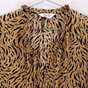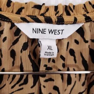 Nine West Blouse Womens Extra Large Tan Black Geometric Ruffle Neck Front Tie