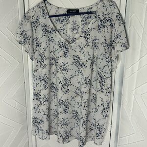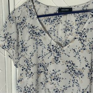 Nine West Blue Beige Crepe Short Flutter Sleeve V-Neck Blouse Size XL