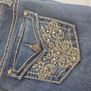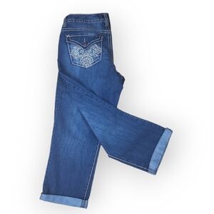 Nine West blue capri jeans with a rolled cuff and embellished back pockets.