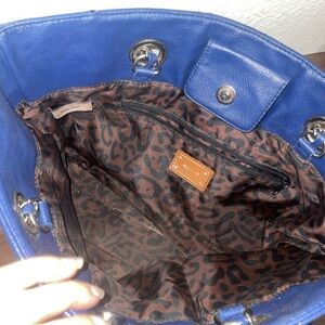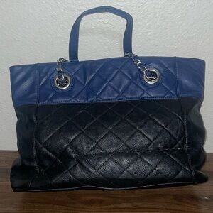 Chic quilted handbag with dual textures. Features a metallic Nine West logo plate.