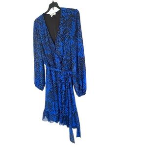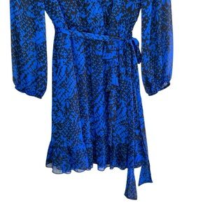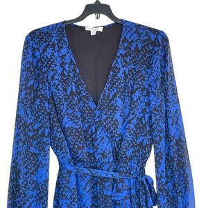 Nine West faux wrap blue animal print dress. Great for work or any other setting! Has a clasp to keep the top closed. Shear long sleeves. And a tie belt that is removable!