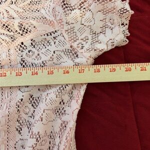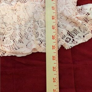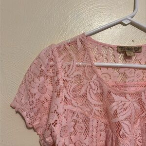 Elegant lace blouse with floral patterns. Features short sleeves and a peplum hem. Perfect for a chic look.