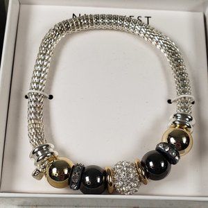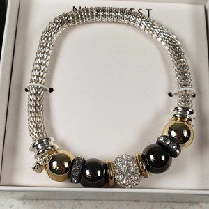 This pretty stretchy Nice West bracelet is new in the box. It is part mesh, silver/gold tone beads with clear Rhinestone accompaniments and center bead.