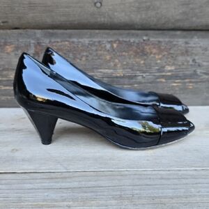 Nine West Bradeton Black Patent Leather, Open Toe, Cone Heel Comfort Pumps 7.5M