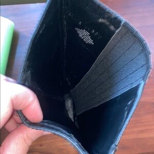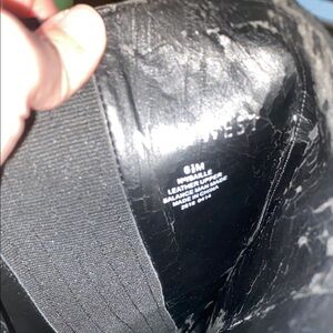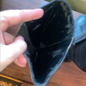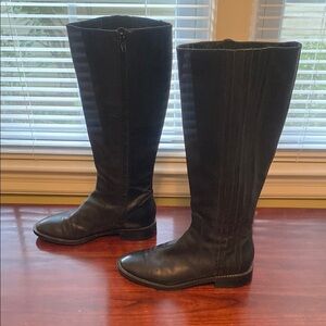 These Nine West knee boots feature a sleek black leather design, offering a smooth finish that exudes elegance. Perfect for elevating any outfit, they provide a comfortable fit and a timeless style that seamlessly transitions from day to night. Exterior in excellent condition. Significant peeling in interior hence price.