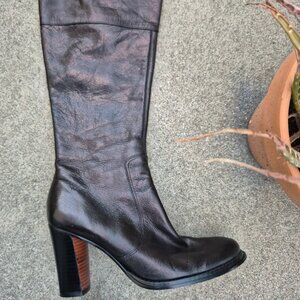Tall bronze crinkle leather boots. Partial side zippers. Chunky heel. Exterior in GUC, interior has flaking.