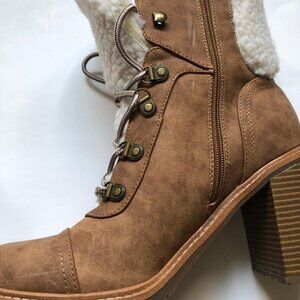 Nine West, Brown Faux Leather, Sherpa Trim, Zipper&Lace-up, Ankle Boot, Sz: 10M