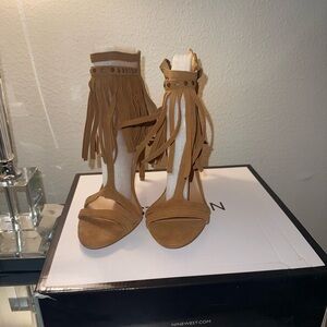 Stylish brown sandals with fringe detail. Perfect for a trendy look.
