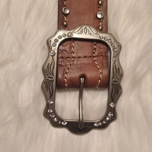 Western style brown leather belt featuring a silver tone buckle with rhinestone & stud detail. Perfect for the cowgirl lover in you!