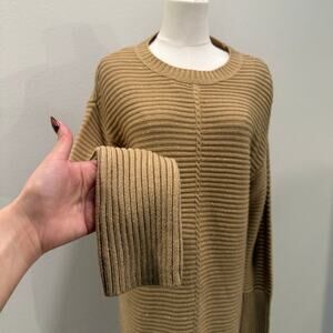 • Soft camel-toned ribbed knit sweater with subtle gold metallic threading for a touch of shimmer